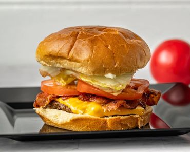 Bacon, mayonnaise, lettuce, tomatoes, beef and American cheese